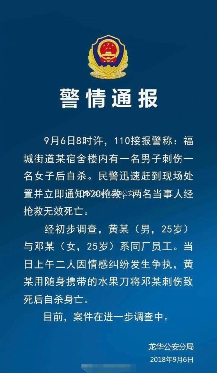 今天中午,深圳市公安局龙华分局发布通报称,今天上午8时 许,110接报警称,福城街道某工厂宿舍楼内有一名男子刺伤一名女子后自杀,民警迅速赶到现场处置并立即通知120抢救, 两名当事人经抢救无效死亡。