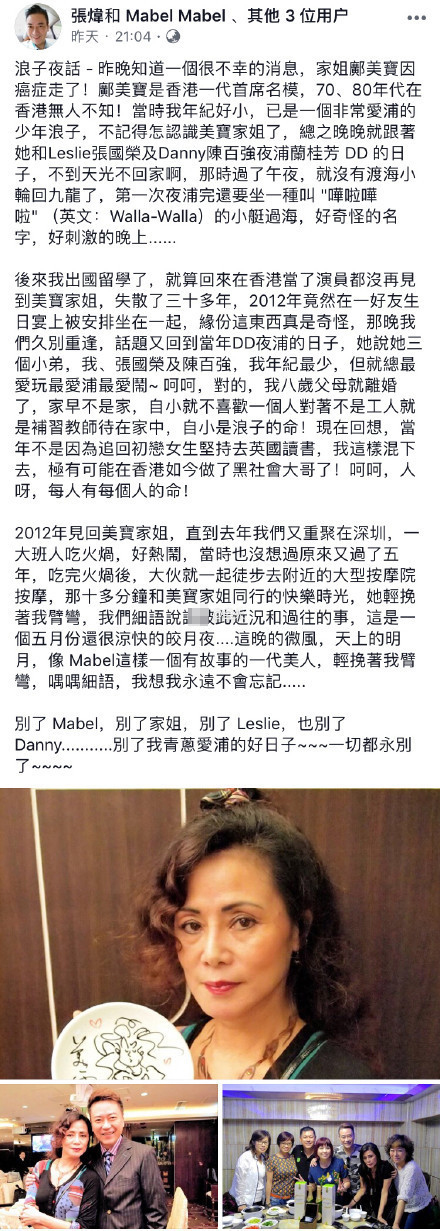 八十年代香港演员兼名模邝美宝被曝出因癌症离世。 昨天,香港艺人张炜发长文称邝美宝已经去世,文中还讲述了很多他与邝美宝年轻时的事情。