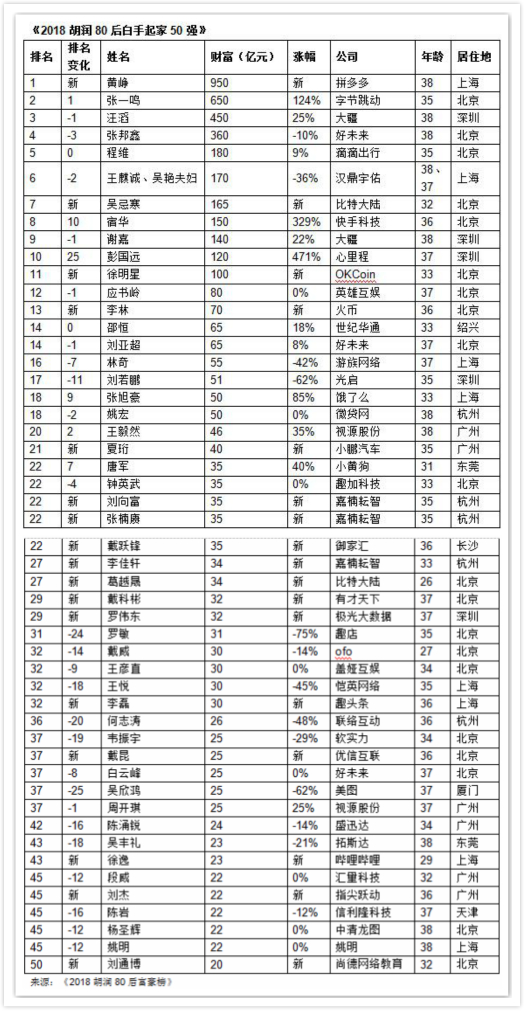 50位上榜的80后成功创业者,比去年多13位,其中新上榜17位,下榜4位。总财富4816亿,平均财富96亿,比去年多15亿。