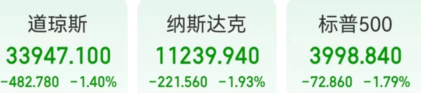 美东时间12月6日,美股三大指数均大幅收跌,纳指跌1.93%;标普500指数跌1.79%;道指下跌482.78点,跌幅1.4%。