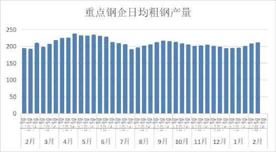 钢价从节前开启上涨之路,钢厂利润有所修复,而且随着在经济复苏预期下,钢厂在节后的复产节奏较快,其中高炉复产较为稳定,电炉复产明显提升。1-2月份统计没有公布粗钢统计数据,但根据钢协统计重点钢企的生产来看,2月下旬共生产粗钢2092.83万吨,日均209.28万吨,环比增至1.49%。市场机构预计1-2月份全国粗钢日均产量在260万吨左右。