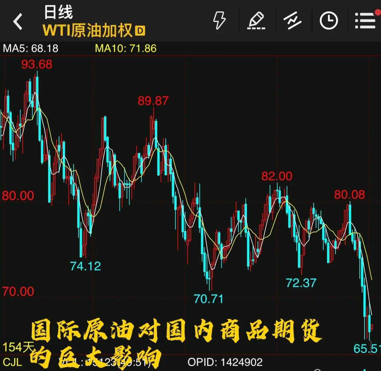 3.还有一些第三中队化工类的,还有黑色系农产品你也可以算上,因为油价一涨的商品自然就贵了嘛,所以当国际原油一大跌或者一涨价,直接影响咱国内的整体市场的一个走势。最后我再插一句嘴哈,就是国际原油有美原油,布伦特油,这俩走势其实都差不多,但是实战当中我经常参考的还是美元。
