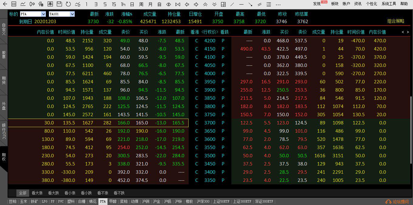 以行权价格为3700元/吨的PTA(TA2101)看涨期权为例子,可以看到行权价格3700元/吨的看涨期权最新的权利金价格为165.5元/吨,代入公式计算买方所需要的权利金=165.5×5=827.5元。