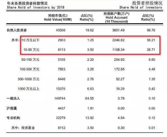 根据《上海证券交易苏统计年鉴2019年卷》显示,截至2018年底,在上交所市场上,持股市值不到10万的个人投资者有2246万户,占比高达58.21%,而持股市值在50万元以下的个人投资者有3344.16万户,占比更是达86.9%。