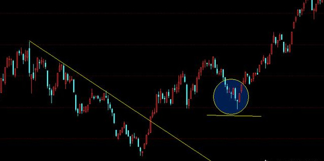 3趋势线。上图突破趋势线,在此我想问几个问题,有多少人是突破趋势线进场的?上图为例,突破趋势线后如果没有上行而是震荡你会怎么处理?如果震荡结束继续下行又将如何?很多人都说突破趋势线进场以抓住所谓大行情。再强调一遍,我们不需要抓住所有行情,我们要用最小的风险去抓住我们能掌握的就好。突破趋势线不一定是趋势反转,还有一种可能是震荡盘整继续下跌。了解K线形态的朋友都知道上图圆圈底部这是什么形态(在此不多做解释了,不了解的朋友可以关注我主页文章里有或者有需要的私信我发资料给你)除了K线形态,还有这个位置,底部压力支撑,所以我们在这里进场是最佳位置,止损设在黄线下方,止盈不设,当K线上行突破前高可以确定上涨趋势,继续持仓,找合适位置加仓,同时设保护止损。