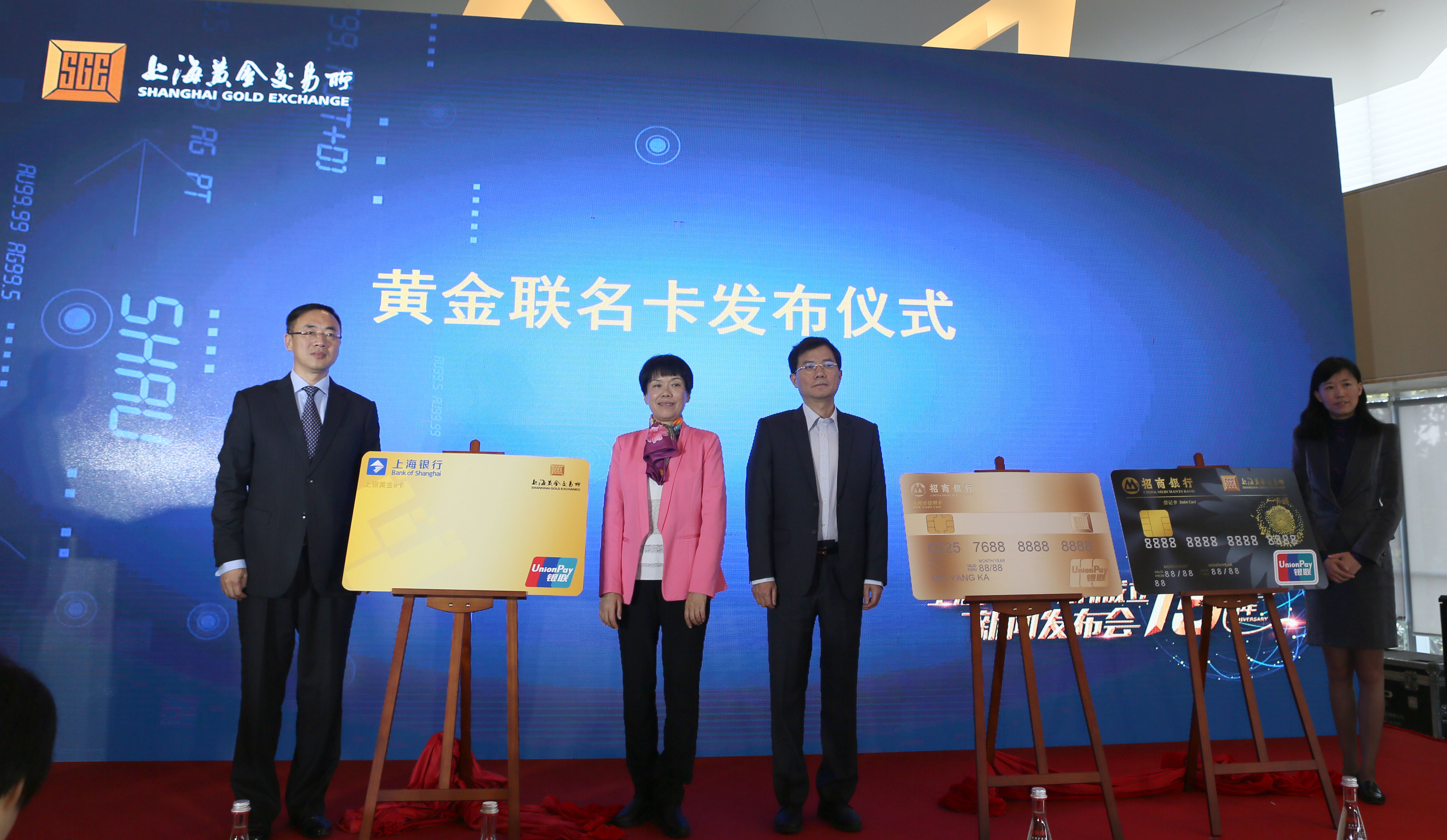 发布会最后,上海黄金交易所副总经理沈刚与上海银行副行长胡德斌,中国银联上海分公司总经理耿静良与招商银行上海分行副行长李慧共同发布了国内首张“黄金”主题银行卡,以深入投资者日常生活的银行卡作为纽带,以“上海金,百姓金”产品作为依托,将十五周年华诞的美好祝福真诚地回馈社会。